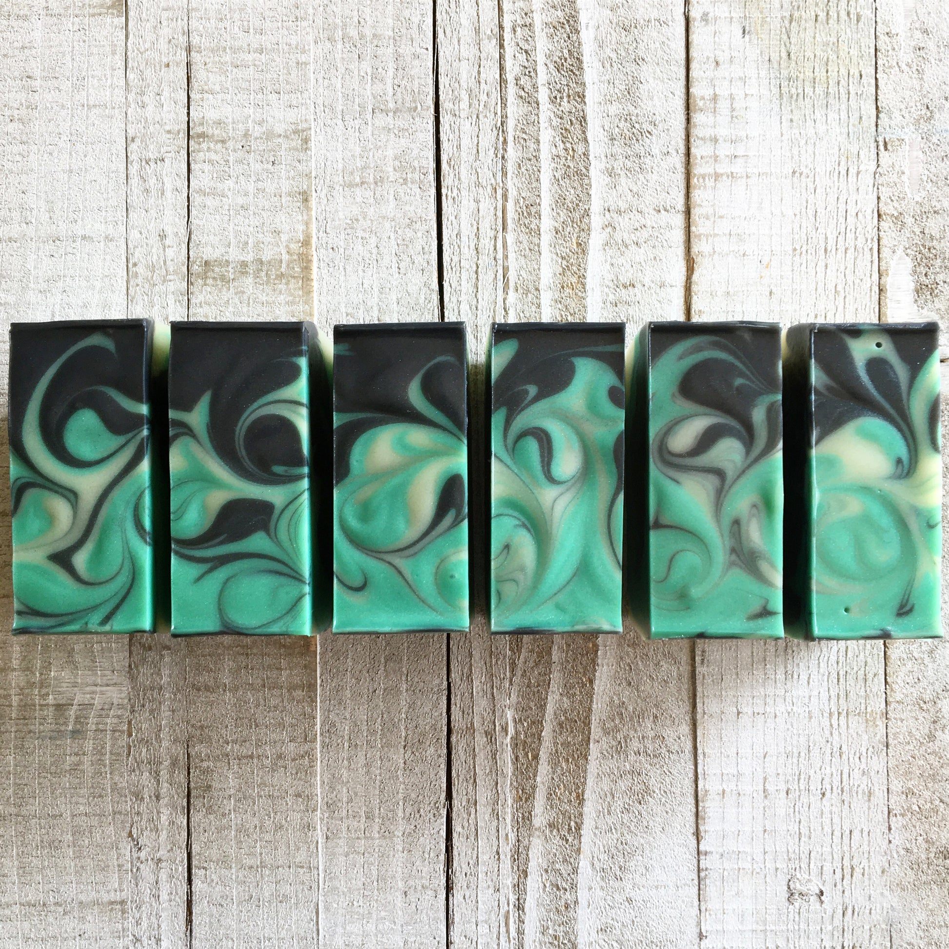 Ingredients: Olive oil, coconut oil, sustainable palm oil, distilled water, sodium hydroxide (lye), castor oil, cocoa butter, shea butter, spearmint essential oil, green mica (mica, titanium dioxide, green chrome oxide), activated charcoal